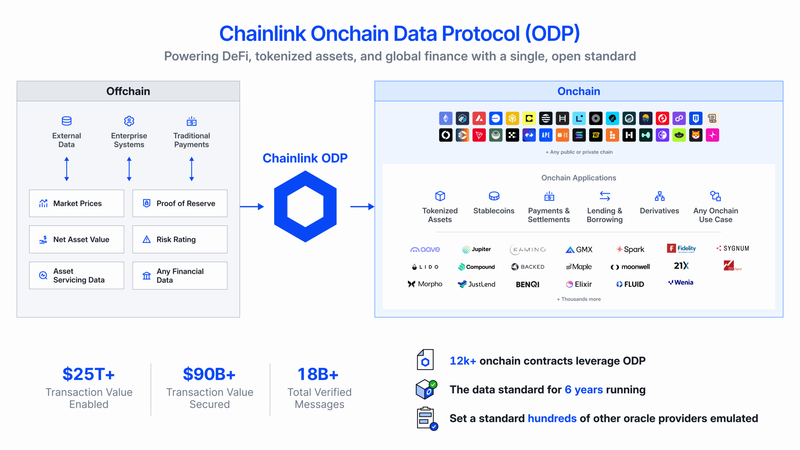 The Onchain Data Protocol (ODP) is an open, protocol-level specification for how a DON aggregates and verifies external data and publishes it onchain. It also encapsulates how applications securely access the data via a consistent set of interfaces across any blockchaināregardless of source, format, aggregation, delivery models, chains used, or use case. All of Chainlinkās data oracle solutions are unified under the ODP standard, giving institutions the foundation they need to seamlessly and securely bring core financial data onchain and power the next generation of global markets.